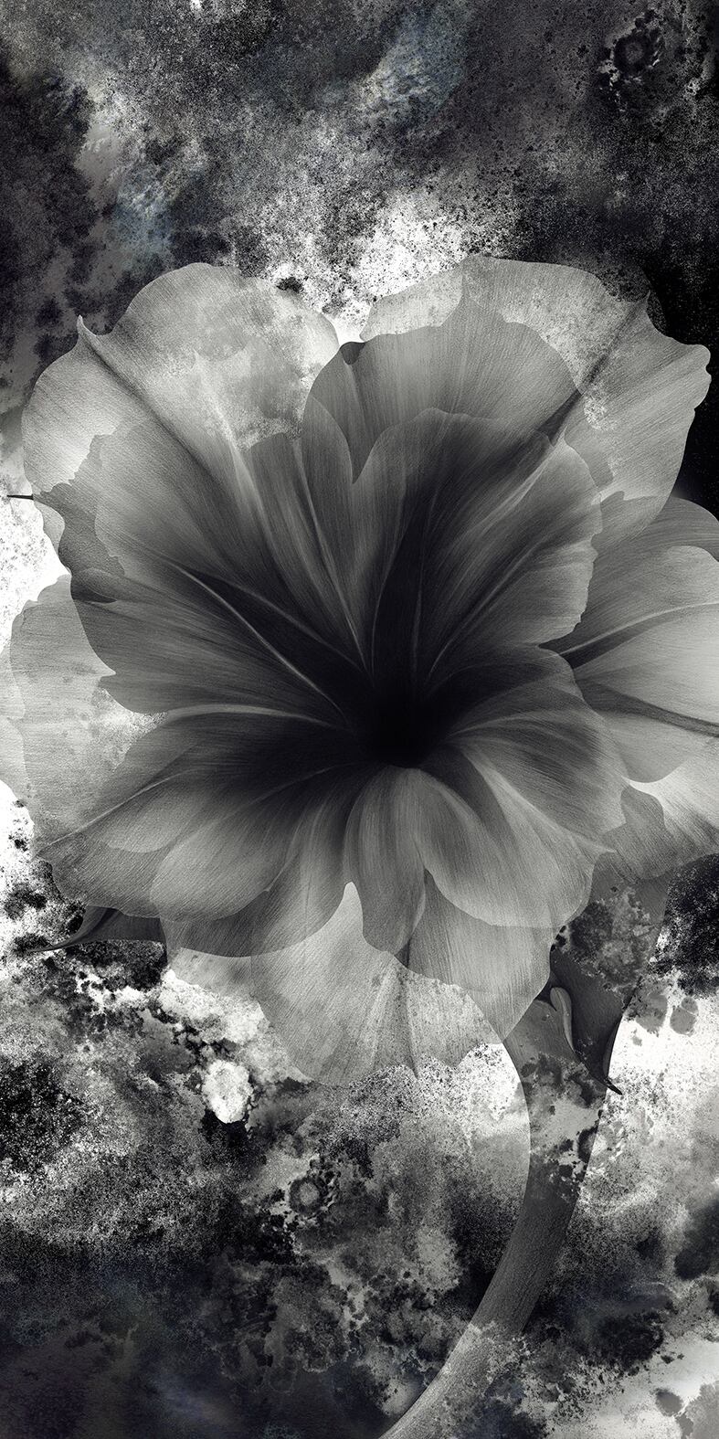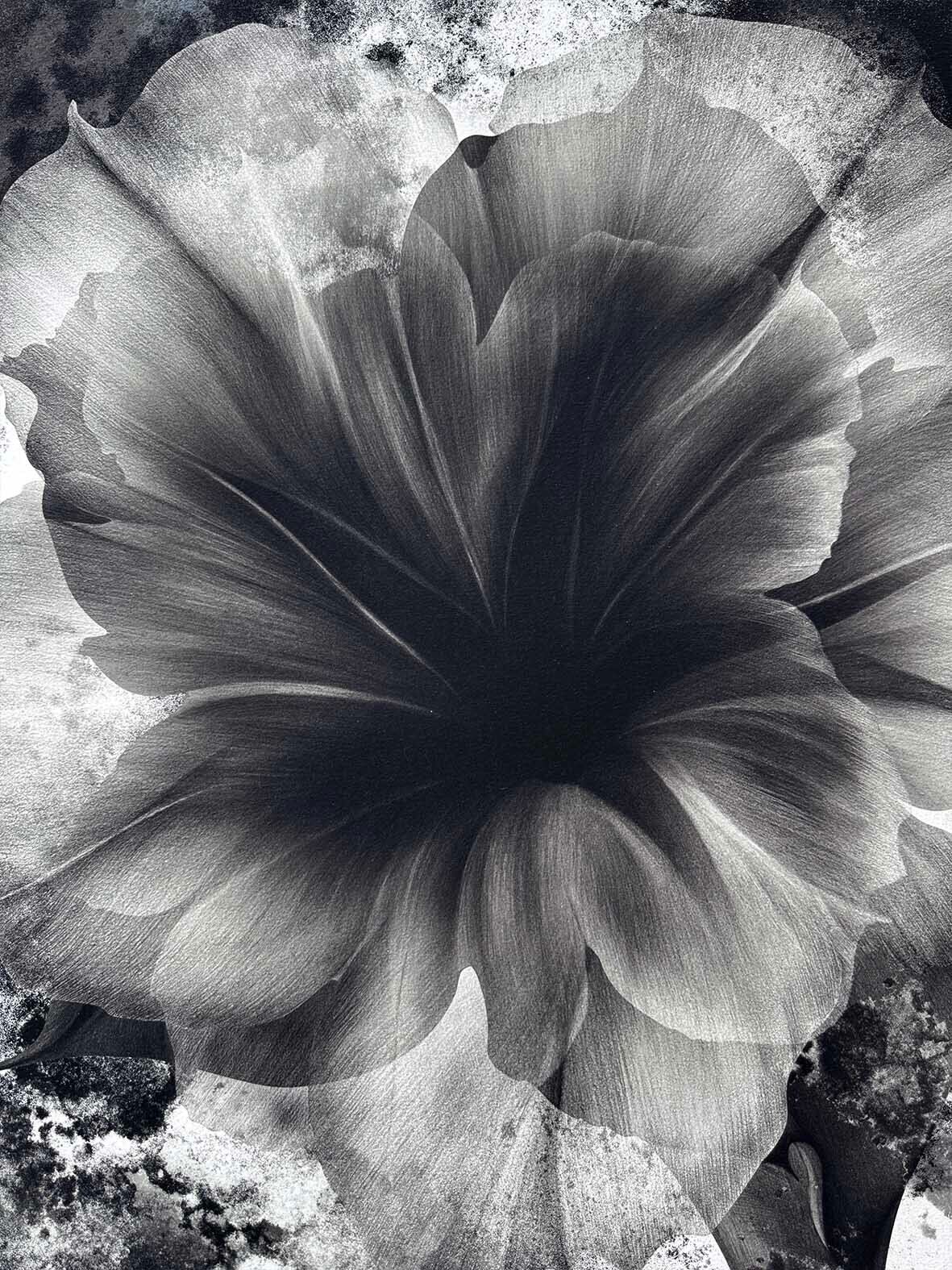 《芯花_005》:モチーフである夜顔(ヨルガオ)がまるでこちらに語りかけてくるようなたたずまい。静謐さと力強さを共存させたようなエネルギーが、空間全体を整いに導いてくれる一枚です。