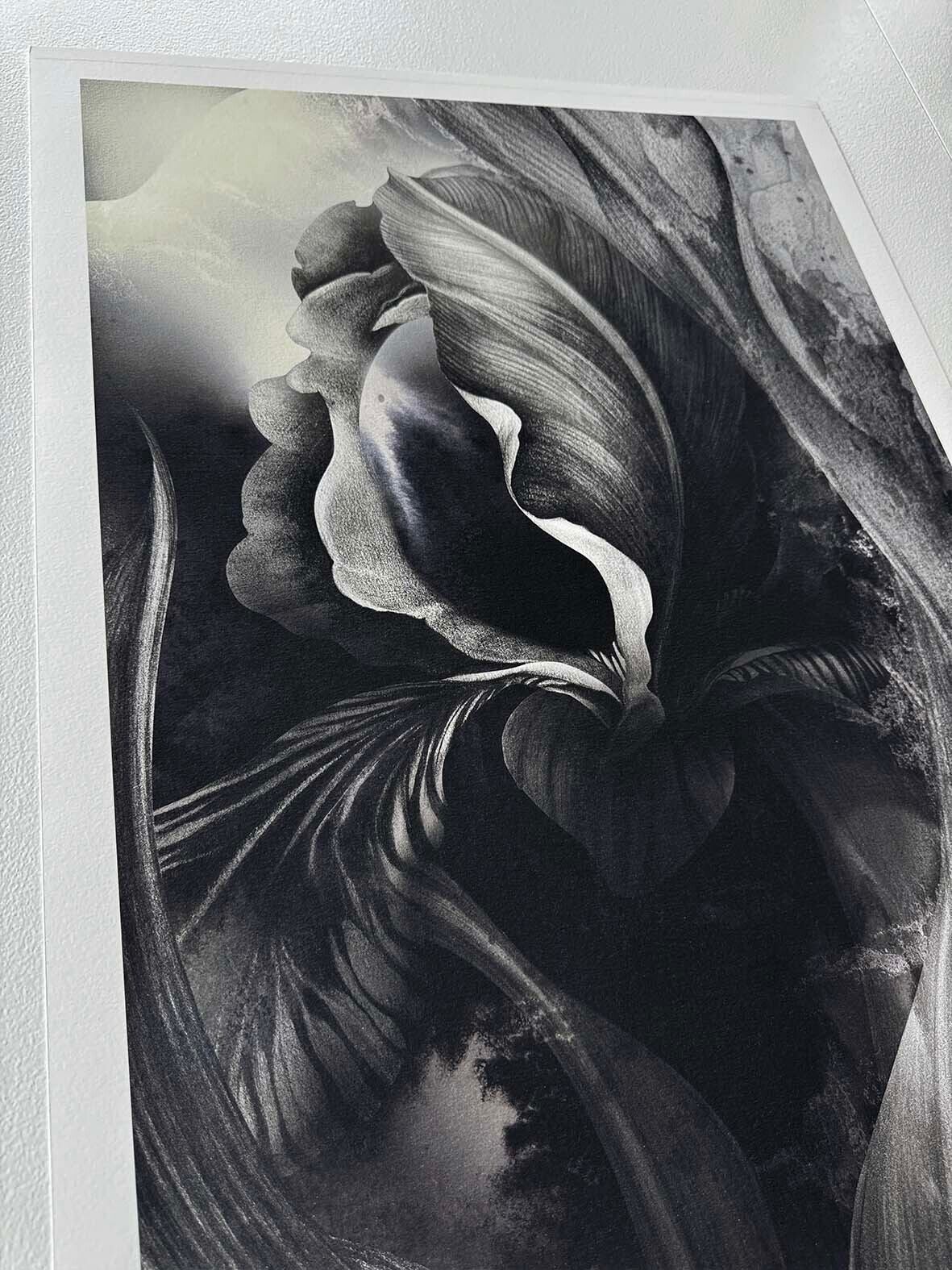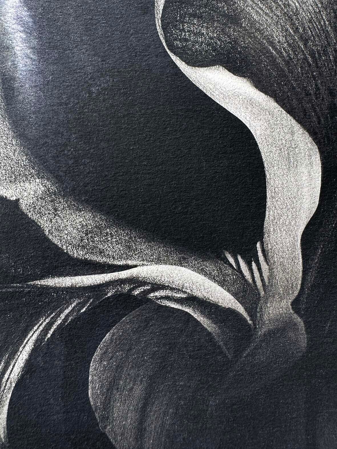 In this particular work, the petals seem to rise inwardly curled, evoking the presence of a quiet, shadowed depth—as if nestled deep within a forest.