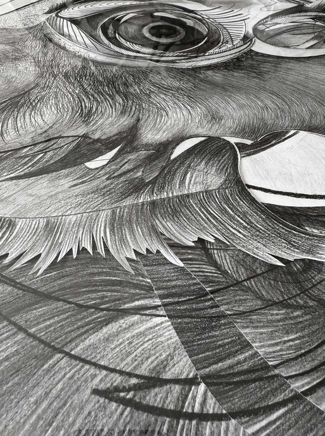 Materials: Pencil, black colored pencil, oil pastel, collage